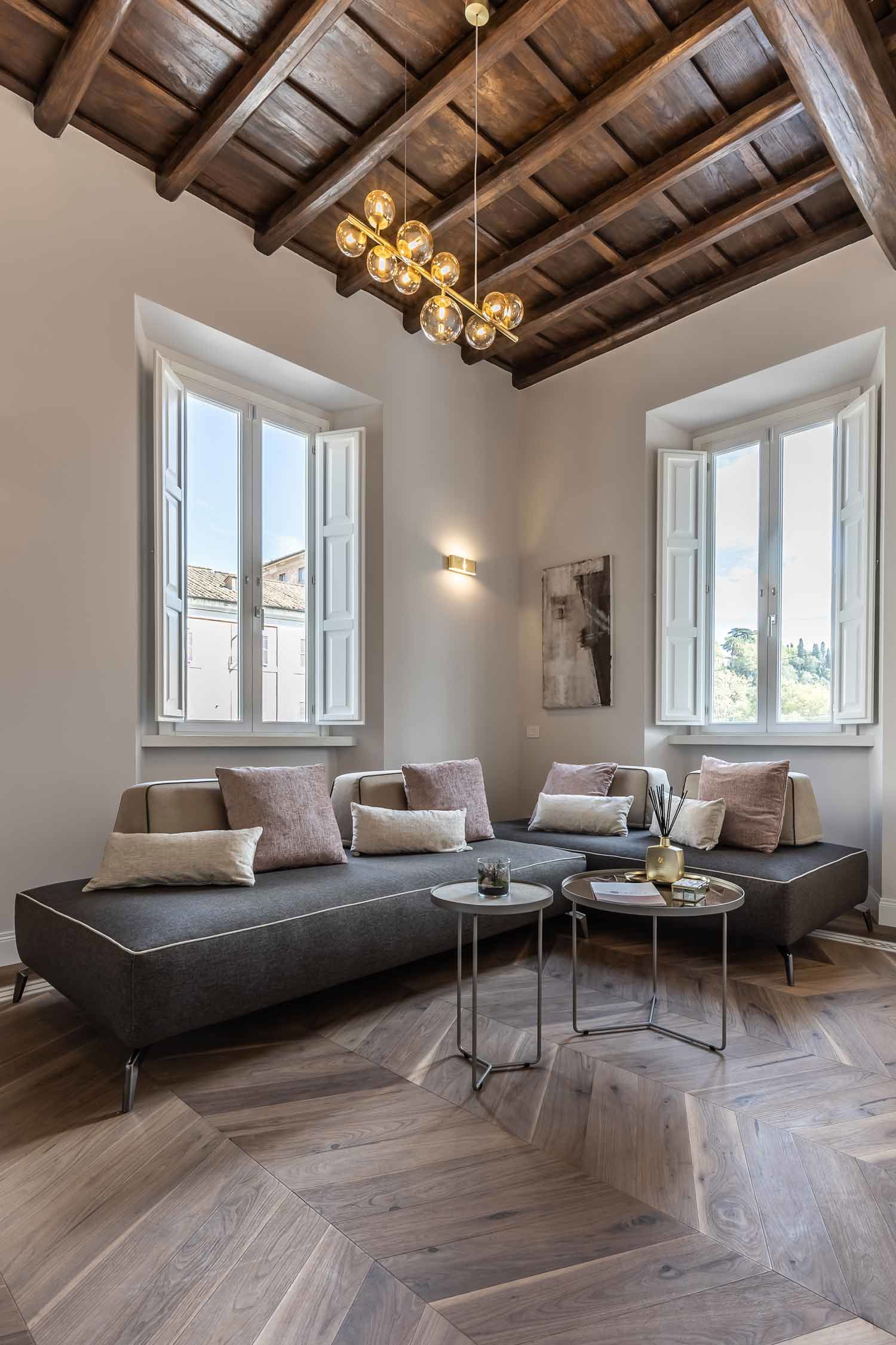 A touch of wellness is provided by the relaxing private Turkish bath, perfect for ending the day. The highlight is undoubtedly the romantic panoramic terrace overlooking the Tiber, the ideal setting for breakfast and aperitifs at sunset.